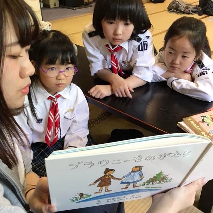 - ブラウニーものがたりを読み聞かせ。小学校低学年のお友だちは真剣に聞いています。